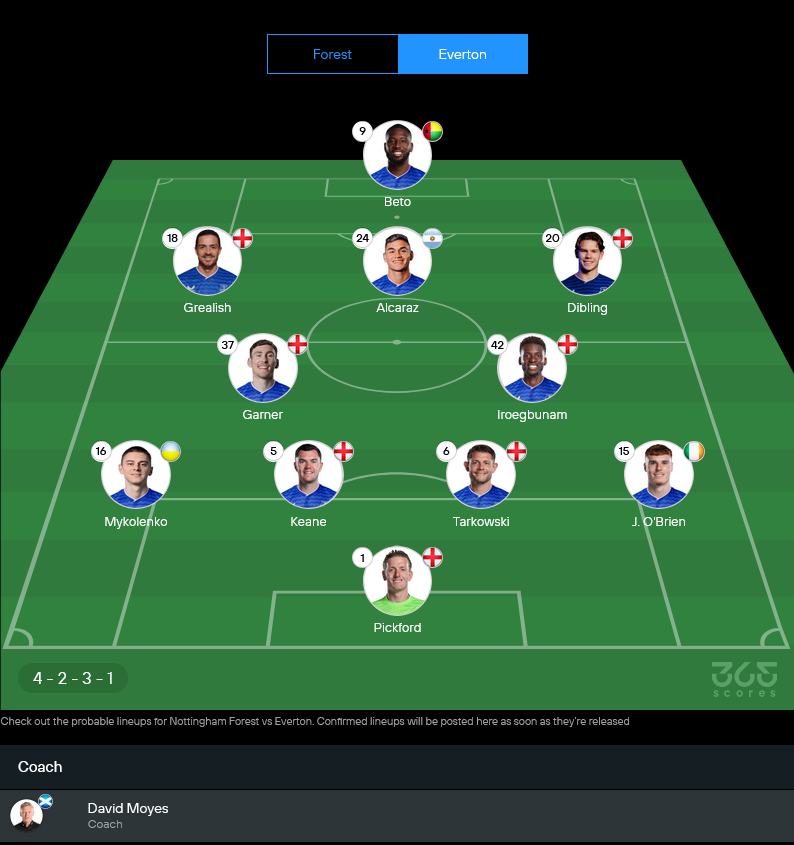 มอยส์น่าจะจัดทัพในระบบ 4-2-3-1 หรือยืดหยุ่นเป็น 4-4-1-1 ใช้คู่เซ็นเตอร์ James Tarkowski กับ Michael Keane มี Mykolenko และ J. O’Brien ยืนแบ็กซ้ายขวา กลางรับฝากไว้กับ Iroegbunam จับคู่ James Garner ส่วนแถวสองวาง Dibling – Alcaraz – Grealish ปั้นเกมอยู่หลัง Beto ที่ยืนค้ำในกรอบเขตโทษ