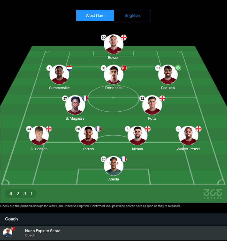 คาดว่า นูโน่ เอสปิริโต้ ซานโต้ จะจัดทัพในระบบ 4-2-3-1 ยึดหน้าเดิมที่เริ่มจับจูนกันติด เอากองหน้าตัวเก่งอย่าง จาร์ร็อด โบเว่น ยืนหอกเป้า โดยมีสามตัวรุกปั้นเกมข้างหลัง