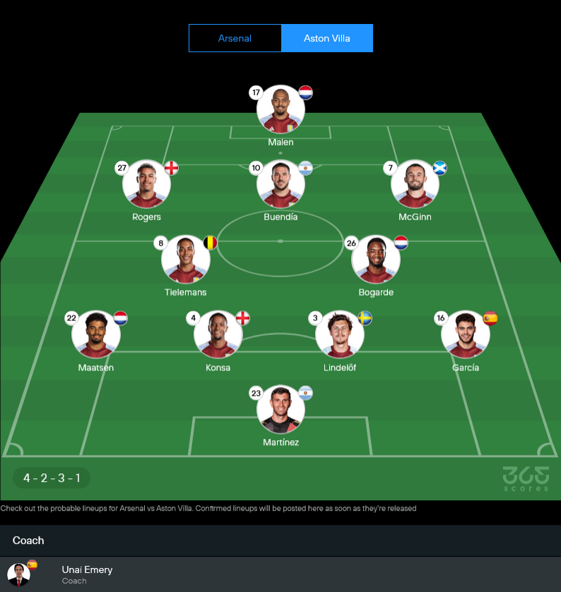 ฝั่งวิลล่าตรงนี้มีปัญหาทีเด็ดเหมือนกันจากภาพข้อมูลที่เห็น ทั้ง รอสส์ บาร์คลีย์ และ ปาอู ตอร์เรส ที่เจ็บ, เอวานน์ เกสซ็องด์ ที่หายไปจากทีม, บูบาการ์ กามารา กับ แม็ตตี แคช ที่ติดโทษแบน และ ไทโรน มิงส์, ฮาร์วีย์ เอลเลียต ต้องรอเช็กความฟิต ทำให้เอเมรีต้องจัดตัวหมุนเวียนพอสมควร