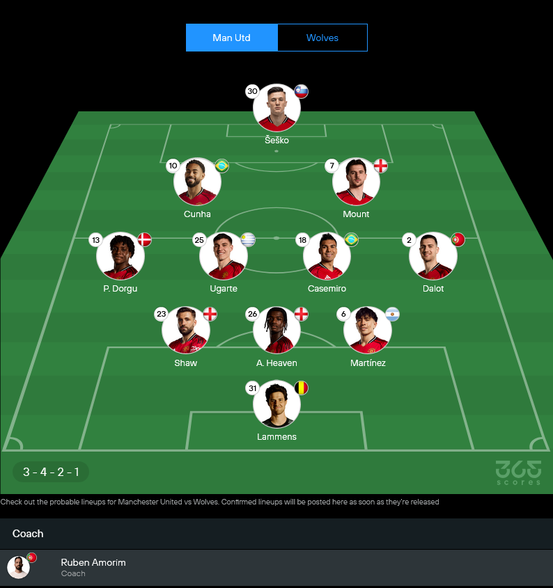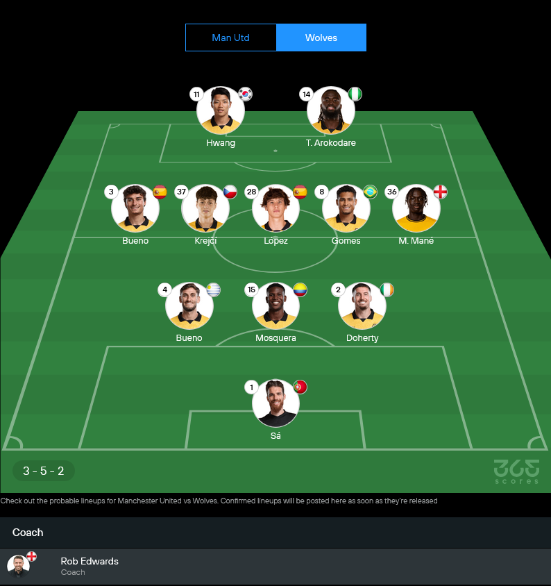 ปีศาจแดงของ รูเบน อโมริม เพิ่งคืนฟอร์มด้วยการเชือดนิวคาสเซิลในบ้าน ทรงเริ่มกลับมาเนียน เกมรุกใช้ เซสโก้ ยืนหน้าเป้า มี เมสัน เมาท์ กับ มาเธอุส คุนญ่า ปั้นเกมด้านหลัง แดนกลางวาง อูการ์เต้ คู่ คาเซมิโร่ มี ดาโลต์ กับ ลุค ชอว์ คอยเติมริมเส้น แผงหลังยืนสามพร้อม ลัมเมนส์ เฝ้าเสา ส่วนฝั่งหมาป่า โรบ เอ็ดเวิร์ดส์ ยังต้องหนีบ๊วย ฟอร์มช่วงหลังแพ้ยาว แต่ยังหวังพลังสวนกลับจาก ฮวาง ฮี ชาน จับคู่ โทลู อาโรโคดาเร่ ในระบบ 3-5-2