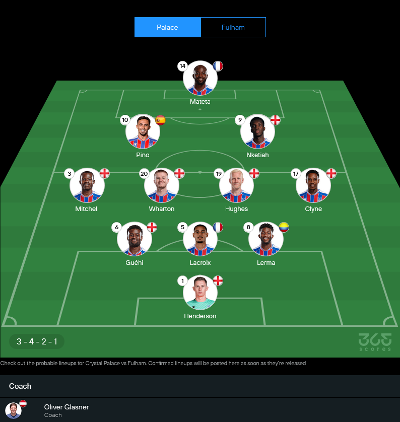 อย่างไรก็ดี กลาสเนอร์ยังยึดระบบ 3-4-2-1 ต่อไป ใช้ ดีน เฮนเดอร์สัน เฝ้าเสา แผงหลังสามคนวาง เจฟเฟอร์สัน เลอร์มา, มักซ็องซ์ ลาครัวซ์ และ มาร์ก เกอี กลางสนามใช้ไทริค มิตเชลล์ กับ นาธาเนียล ไคลน์ ทำหน้าที่วิงแบ็กสองฝั่ง คู่กลาง วิลล์ ฮิวจ์ส จับคู่ อดัม วอร์ตัน ส่วนแนวรุกเป็นหน้าที่ของ เยเรมี่ ปิโน่ กับ เอ็ดดี้ เอ็นเคเทียห์ ปั้นเกมอยู่ข้างหลัง ฌอง ฟิลิปป์ มาเตต้า ที่ยืนหอกเดี่ยว ลุ้นปิดบัญชีในกรอบเขตโทษ