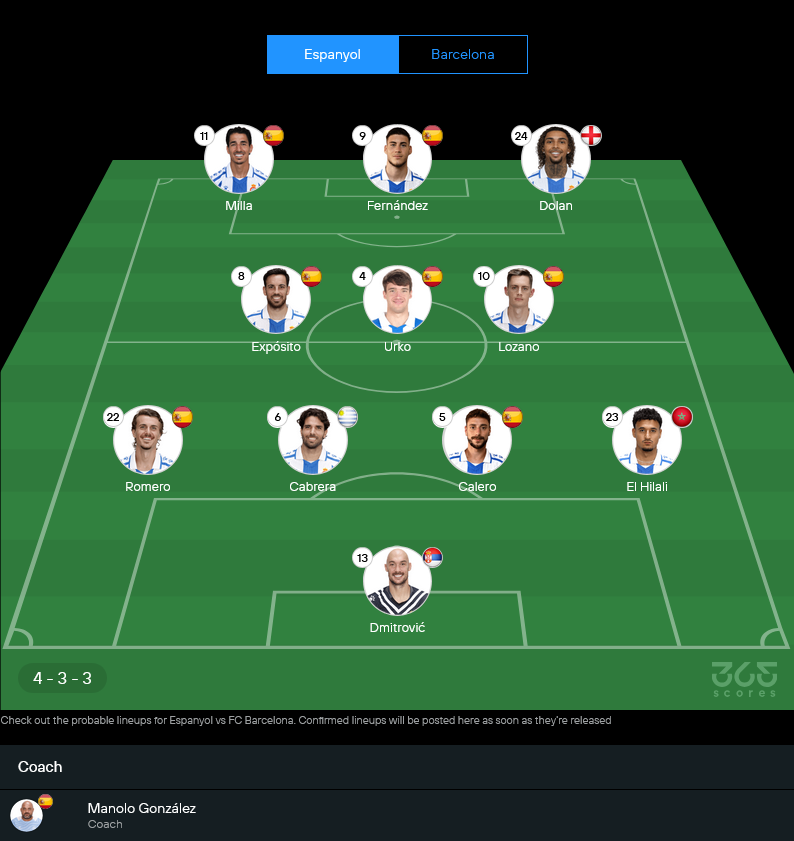 เอสปันญ่อลมีข่าวไม่ค่อยดีเรื่องตัวผู้เล่นอยู่บ้าง เพราะยังต้องเช็กฟิต ฆาบี ปูอาโด้ ที่สภาพไม่เต็มร้อย ส่วน ราม่อน เทร์รัตส์, ชาร์ลส์ พิคเคล และลูก้า โคเลโอโช่ ยังเดี้ยงยาว ใช้งานไม่ได้ทั้งหมด แต่ภาพรวมยังถือว่าขุมกำลังหลักแน่นพอจะรับมือบาร์ซ่าได้ แท็กติกน่าจะยืนระบบ 4-3-3 เน้นเกมรับแน่นกลางสนามแพ็กสามตัว แล้วปล่อยสปีดริมเส้นไปเล่นงานจังหวะสวน