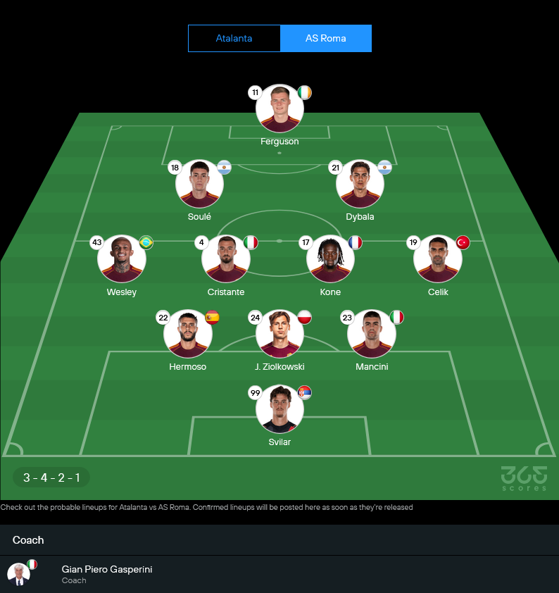 ฝั่งโรม่าอาจจะตัวเจ็บเยอะ แต่จุดเด่นคือเกมรับและวินัยที่ดีขึ้น รวมถึงการต่อบอลจากหลังขึ้นหน้าค่อนข้างไหลลื่น เมื่อมีดีบาล่าคุมจังหวะในพื้นที่สุดท้าย บวกกับลูกลุยของซูเล่และเฟอร์กูสัน ทำให้หมาป่ามีทีเด็ดหวังประตูได้ตลอดเวลา ประสบการณ์ของกาสเปรินี่กับการรู้สไตล์นักเตะอตาลันต้าทุกมุม ยิ่งทำให้ภาพออกมาเหมือนเขาเตรียมมาเล่นงานทีมเก่าตัวเองแบบเน้นๆ