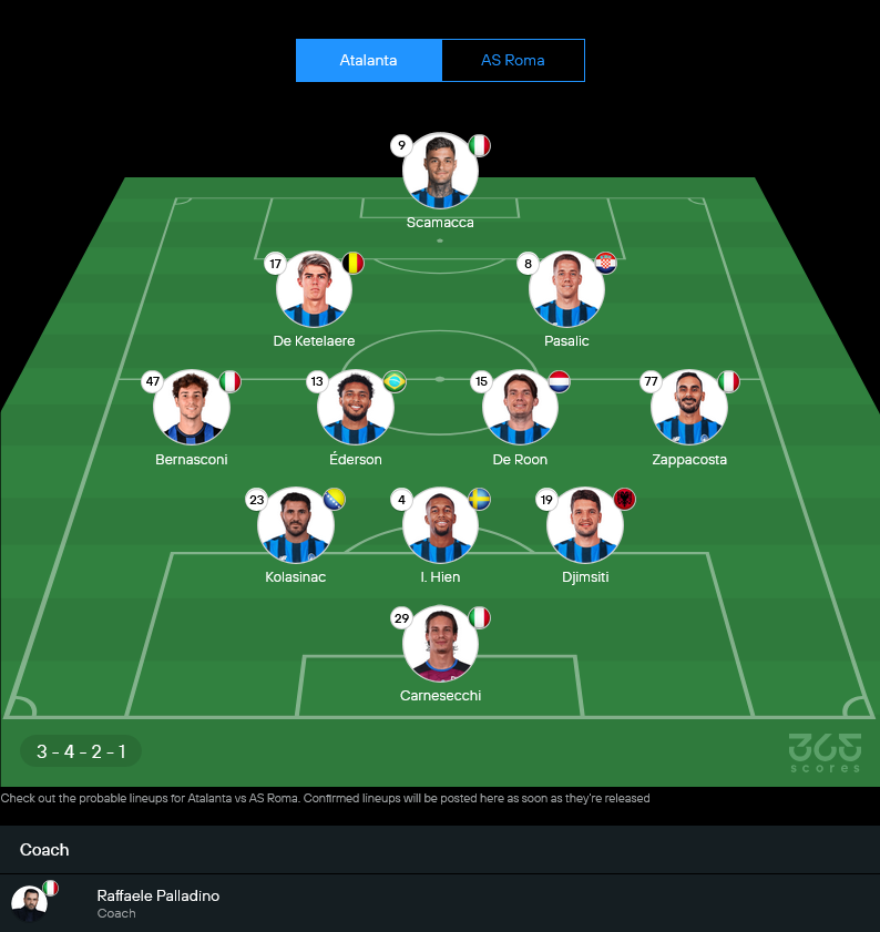 ฝั่งโรม่าอยู่ภายใต้การคุมทีมของ จาน ปิเอโร่ กาสเปรินี่ ที่รู้ไส้รู้พุงอตาลันต้าเป็นอย่างดี จุดนี้ทำให้เกมนี้ยิ่งมีชั้นเชิงเพิ่มขึ้นไปอีก สภาพทีมตอนนี้มีปัญหาตัวเจ็บยาวๆ หลายราย ทั้งกัปตันอย่าง ลอเรนโซ่ เปลเลกรินี่, เอโดอาร์โด้ โบเว่, ทอมมาโซ่ บัลดานซี่ รวมถึงแนวรับตัวหลัก เอแวน เอ็นดิกก้า และ แยน ซิออลคอฟสกี้ ยังเดี้ยงอยู่ ส่วน เซกี้ เซลิค ก็ยังไม่พร้อมเต็มร้อย ด้าน เลออน ไบลีย์ มีสถานะใกล้เคียงกับเช็กฟิต