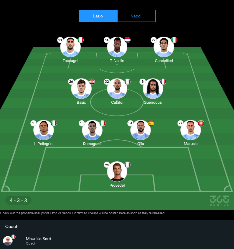 ฝั่งเจ้าบ้าน เมาริซิโอ ซาร์รี่ ได้สองกองกลางอย่าง โตม่า บาซิช กับ มัตเตโอ เกนดูซี่ พ้นโทษแบนกลับมาช่วยทีมเพิ่มตัวเลือกแดนกลาง ส่วนแนวรุกยังต้องรับมือการขาด บูลาย เดีย กับ ฟิซาโย เดเล่-บาชิรู ที่บินไปรับใช้ชาติในศึกแอฟริกา คัพ ออฟ เนชันส์ ขณะที่ นิโคโล่ โรเวลล่า กับ ซามูแอล ชิโกต์ ยังเดี้ยงต่อเนื่อง แถม เอลเซอิด ฮีซาย ยังต้องรอเช็กความฟิตอีกหนึ่งราย
