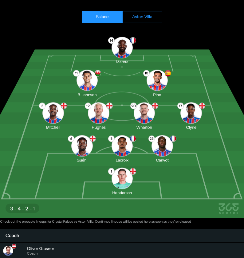 กลาสเนอร์ยังต้องปวดหัวกับสภาพทีมที่ไม่สมบูรณ์ ตัวหลักเจ็บสะสมเพียบ ไล่ตั้งแต่ ชาดี้ ริอัด, ชี๊ค ดูกูเร่, ไดจิ คามาดะ, ดาเนี่ยล มูนญอซ, ริโอ การ์ดไดน์, เคเล็บ คอร์ฟา รวมถึง อิสไมล่า ซาร์ ที่เดี้ยงยาว ส่วน เจฟเฟอร์สัน เลอร์มา, เอ็ดเวิร์ด เอ็นเคเทียห์ และ คริส ริชาร์ดส์ ยังอยู่ในกลุ่มเช็คฟิตจากอาการเจ็บเล็กน้อย ข้อมูลจากภาพไลน์อัพล่าสุดชี้ว่าพาเลซน่าจะยึดระบบ 3-4-2-1 ตามถนัด ดีน เฮนเดอร์สัน เฝ้าเสา แนวรับสามตัวใช้ มาร์ก เกอี, มักซ็องซ์ ลาครัวซ์ และ เจย์ดี ก็องโวต์ วิงแบ็กสองฝั่งเป็น ไทริค มิตเชลล์ กับ นาธาเนี่ยล ไคลน์ กลางสนาม วิลล์ ฮิวจ์ส จับคู่กับ อดัม วาร์ตัน ส่วนเกมรุกให้ เบรนแนน จอห์นสัน กับ เยเรมี่ ปิโน่ ปั้นเกมหลังหัวหอกตัวเป้า ฌ็อง-ฟิลิปเป้ มาเตต้า