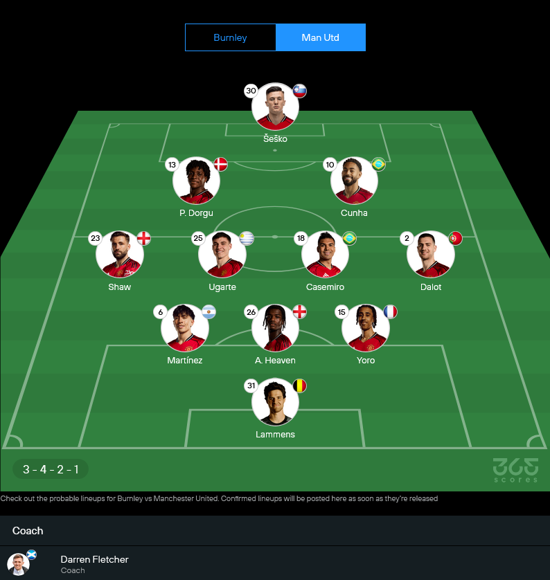 เฟล็ทเชอร์มีโอกาสวางหมากในระบบ 3-4-2-1 ใช้กองหลังสามคนคุมพื้นที่หน้าเขตโทษ เปิดทางให้วิงแบ็กเติมสูง แล้วใช้ Casemiro จับคู่ Ugarte คุมจังหวะแดนกลาง ด้านบนให้ Dorgu กับ Matheus Cunha เคลื่อนที่อิสระหลัง Benjamin Sesko ที่ยืนหน้าเป้าคอยปิดบัญชี