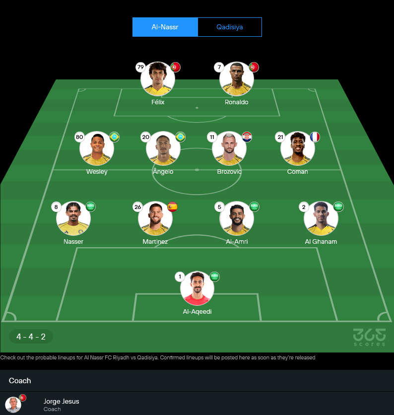 แผนที่น่าจะใช้คือ 4-4-2 เปิดเกมรุกใส่ตั้งแต่นาทีแรก แดนกลางมี เวสลีย์, อันเจโล่, โบรโซวิช และ โกม็อง คอยคุมจังหวะ บดบี้และต่อบอลขึ้นหน้า ส่วนแนวรับนำโดย มาร์ติเนซ กับ อัล อัมรี ยืนเซ็นเตอร์ และ อัล ฆอนาม กับ นาสเซอร์ ดูแลริมเส้น