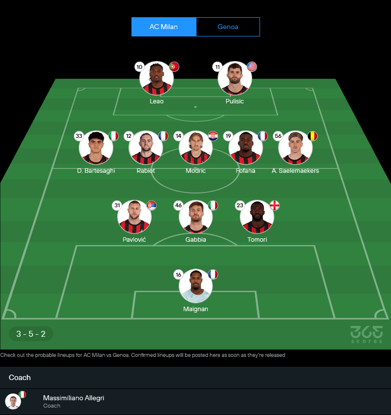 ฝั่งเจ้าถิ่นของกุนซือ มัสซิมิเลียโน อัลเลกรี ยังยึดโครง 3-5-2 ตามภาพที่โผล่บนสนามกราฟิกในไลน์อัพ ตัวหลักอย่าง ไมค์ เมนญ็อง ยืนเฝ้าเสา สามเซ็นเตอร์ใช้ สตานิสลาฟ พาฟโลวิช, มัตเตโอ กับเบีย และ ฟิกาโย โทโมริ แผงกลางห้าคนมี ดาวิเด้ บาร์เตซากี ยืนวิงซ้าย อเล็กซิส แซเลแมเกอร์ส ทางขวา ตรงกลางวาง ยูซูฟ โฟฟานา, ลูก้า โมดริช และ อาเดรียง ราบิโอต์ คอยคุมจังหวะ เกมรุกปล่อยให้ ราฟาเอล เลเอา จับคู่ คริสเตียน พูลิซิช ไล่ล่าตาข่าย