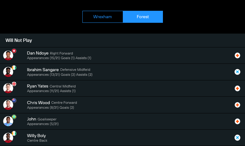 อย่างไรก็ตาม ฟอเรสต์ยังพอมีชุดใหญ่ให้ใช้งาน คาดว่าจะยึดระบบ 4-2-3-1 ตามมาตรฐานของไดช์ มี เซลส์ เฝ้าเสา แผงหลังจากขวาไปซ้าย ไอน่า, มิลินโควิช, มูริโย่, เนโก วิลเลียมส์ กลางคู่ใช้ โดมิงเกซ จับคู่ แอนเดอร์สัน ส่วนสามตัวรุกด้านหลังหอกจัด ฮัตชินสัน ทางขวา, กิ๊บส์ ไวท์ เล่นเพลย์เมคเกอร์ตรงกลาง, ฮัดสัน โอดอย ลากเลื้อยทางซ้าย และให้ อิกอร์ เฮซุส ยืนหน้าเป้าไล่กดดันแนวรับเจ้าบ้าน