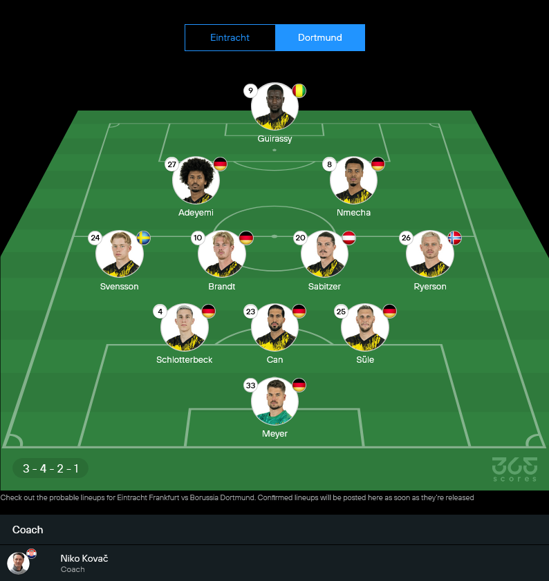 ประเด็นสำคัญคือการจับคู่แดนกลาง ซาบิตเซอร์ กับ เอ็นเมช่า ถ้าคุมจังหวะได้ เกมรุกเสือเหลืองจะไหลลื่นมาก บรันด์ท มีพื้นที่ให้เล่นบอลระหว่างไลน์แนวรับกับแดนกลางแฟร้งค์เฟิร์ต ซึ่งเป็นจุดที่เจ้าถิ่นหลวมๆ อยู่แล้ว เมื่อบวกกับความคมของ กีราสซี่ และสปีดของ อเดเยมี่ โอกาสที่ดอร์ทมุนด์จะบุกมายิงได้อย่างน้อยหนึ่งลูกถือว่าสูง