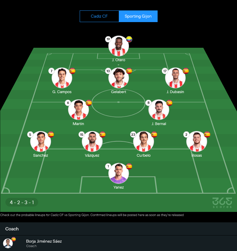 ฝั่งทีมเยือนสปอร์ติ้ง กิฆอนของกุนซือบอร์ฆา ฆิเมเนซ ขาด มามาดู เอ็นดิอาย มิดฟิลด์ตัวชนสำคัญที่เจ็บอยู่ รวมถึงแบ็กซ้าย ไบรอน โอลิบัน ที่ติดโทษแบน แต่ภาพรวมยังมีตัวแทนลงเสียบได้ไม่ตกชั้นคุณภาพ รูปแบบการเล่นคาดว่าจะจัด 4 2 3 1 ตามที่ใช้บ่อยในลีก เน้นเก็บบอลกลางสนามแล้วเปลี่ยนสปีดขึ้นหน้าเร็ว