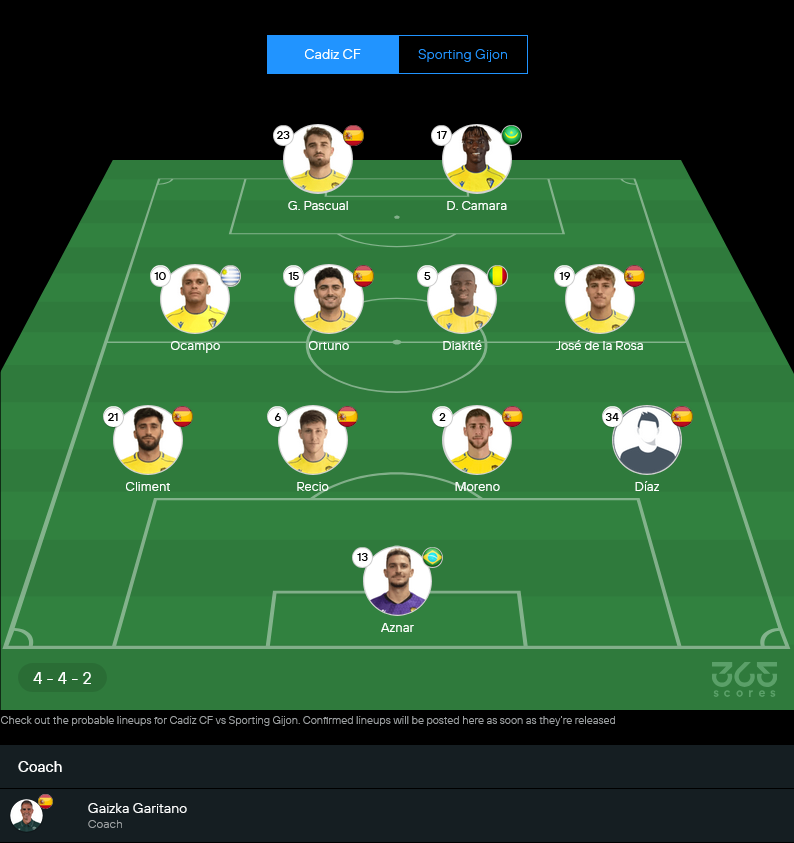 กาดิซภายใต้การคุมทีมของไกต์ซก้า การิตาโน่ ยังขาดตัวหลักหลายรายอย่าง ซูโซ่, โบยาน โควาเซวิช, ฆัวคิน กอนซาเลซ, ฟาลี และ อัลเฟร็ด ไกเซโด้ ที่เจ็บยาว แต่ข่าวดีคือโครงหลักที่ทำทีมรอดมาหลายนัดยังพร้อมลุย คาดว่าจะจัดระบบ 4 4 2 ตามสไตล์ถนัด เน้นเกมริมเส้นและลูกเปิดจากด้านข้างเป็นหลัก ซึ่งเข้าทางสไตรเกอร์ร่างใหญ่ของทีมพอดี