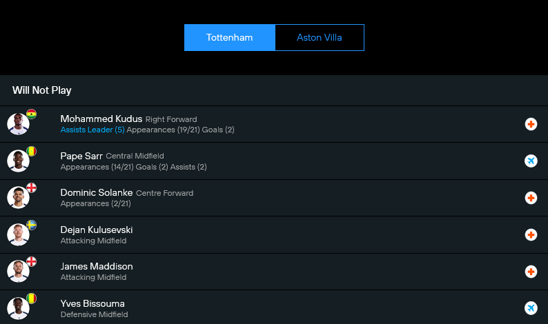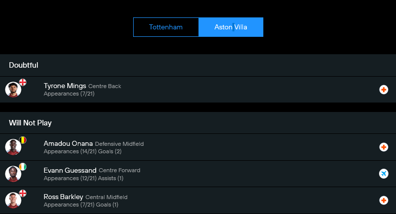 ฝั่งวิลล่าของ อูไน เอเมรี่ สถานการณ์ตัวผู้เล่นดีกว่าสเปอร์สเล็กน้อย มีข่าวไม่ดีเล็กๆ คือ ไทโรน มิงส์ กองหลังจอมโขกยังต้องเช็กฟิต จัดอยู่ในกลุ่ม “สุ่มเสี่ยงลงไม่ได้” ขณะที่ อมาดู โอนาน่า, เอวานน์ เกสซ็องด์ และ รอสส์ บาร์คลี่ย์ อยู่ในกลุ่ม “จะไม่เล่นแน่นอน” จากอาการเจ็บหรือสภาพร่างกายยังไม่เต็มร้อย แต่โดยรวมโครงสร้างหลักยังอยู่กันครบ