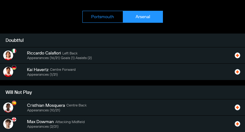 ฝั่งทีมเยือนของ มิเกล อาร์เตต้า โรเตตกันพอสมควรแต่คุณภาพยังโหดเหมือนเดิม ปัญหาตัวเจ็บมี คริสเตียน มอสเกร่า กับ แม็กซ์ ดาวแมน ที่เดี้ยงยาว ส่วน ริคคาร์โด้ คาลาฟิโอรี่ และ ไค ฮาแวร์ตซ์ อยู่ในกลุ่มต้องเช็คฟิตเพิ่ม ทำให้แนวรับกับแดนกลางบางจุดต้องใช้ตัวสำรองลงอัดเกมถ้วยนัดนี้ แต่ระดับอาร์เซนอลแล้ว สำรองก็แทบจะเป็นตัวจริงของหลายทีมในลีกเดียวกัน