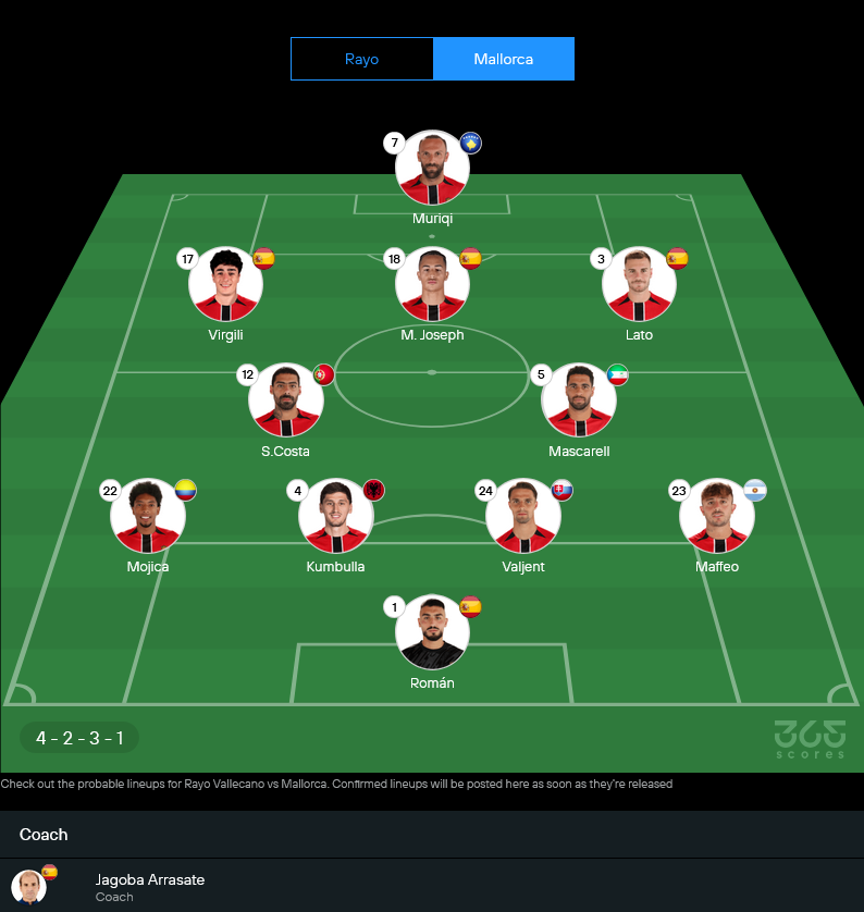 | 20/10/2024 | ลาลีกา | มายอร์ก้า 1-0 ราโย บาเยกาโน่ |