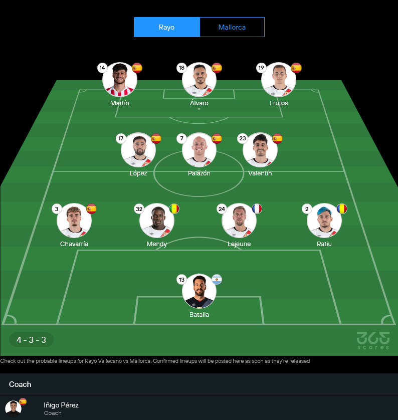 ฝั่งเจ้าบ้านของโค้ช อีญีโก เปเรซ ยังมีปัญหาตัวผู้เล่นให้ต้องคิดเยอะ ทั้งชุดเจ็บและชุดเช็กฟิต ตามข้อมูลล่าสุดจากสกอร์บอร์ดทีมแพทย์ ราโยยังขาด ปาเต้ ซิสส์ ที่ไปเล่นทัวร์นาเมนต์ทีมชาติ รวมถึง ดิเอโก เมนเดซ กับ อเลเมา ที่อยู่ในลิสต์เดี้ยง และยังต้องลุ้นความฟิตของ อับดุล มูมิน กับ อีบัน บัลลิอู ที่ถูกมาร์กไว้เป็นกลุ่มเสี่ยง ส่วน ลุยซ์ เฟลิเป้ เองก็ไม่พร้อม กลายเป็นงานหนักของแนวรับพอสมควร ดีที่แดนกลางได้ อูไน โลเปซ พ้นโทษแบนกลับมาเติมสมดุลให้ทีม