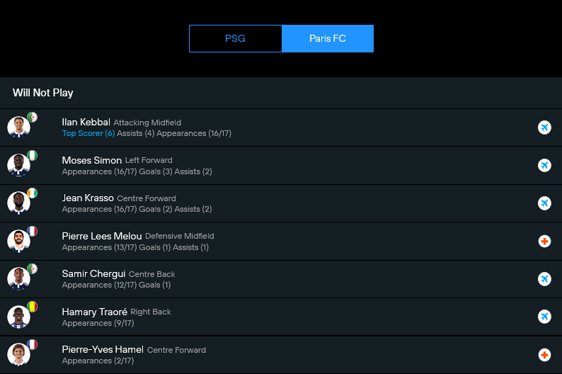 ฝั่งปารีส์ เอฟซี ต้องบอกว่าเล่นเกมนี้แบบสภาพไม่เต็มร้อย ตัวสำคัญหายไปเพียบ ทั้งอิลาน เคบบัล เพลย์เมกเกอร์ตัวเก่ง, โมเสส ไซม่อน ปีกรถด่วน, ฌอง ฟิลิปป์ คราสโซ่ หัวหอกขยัน และสองแข้งแอฟริกันอย่างเคบบัลกับไซม่อนก็กำลังติดภารกิจแอฟริกันคัพ เช่นเดียวกับคราสโซ่ ขณะที่ปิแอร์ ลีส์ เมลู มิดฟิลด์เชื่อมเกม, ซามีร์ แชร์กี กองหลังตัวหลัก และฮามารี่ ตราโอเร่ แบ็กขวาจอมลุย ต่างมีอาการเจ็บรบกวน นี่ยังไม่นับปิแอร์ อีฟ ฮาเมล ที่เจ็บกล้ามเนื้อต้นขาอีกคน
