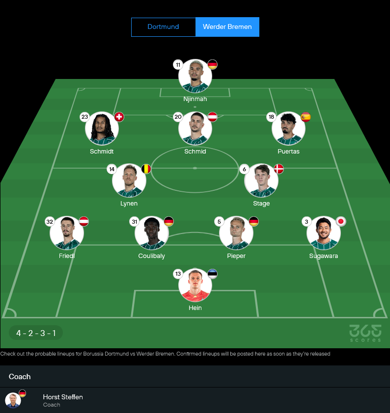 จากภาพรวมก่อนแข่ง ดอร์ทมุนด์ยังคงวางตัวหลักชุดใหญ่ลงครบ แถมแนวรุกจัดเต็มทั้ง กีราสซี่, บรันด์ท, เบเยอร์ และคู่กลางอย่าง ซาบิตเซอร์–นเมช่า ส่วนเบรเมนมาในสไตล์รับเหนียวรอโต้ ใช้ชุด 4-2-3-1 เน้นสปีดจัดของ เอ็นยินมาห์, ปูเอร์ตาส และจอมถึกแดนกลาง สเตจ ช่วยกันวิ่งชนทุกจังหวะ เรียกง่ายๆ ว่าเกมนี้ใครเสียงดังกว่า ใครคมกว่ากินกันไปเลย