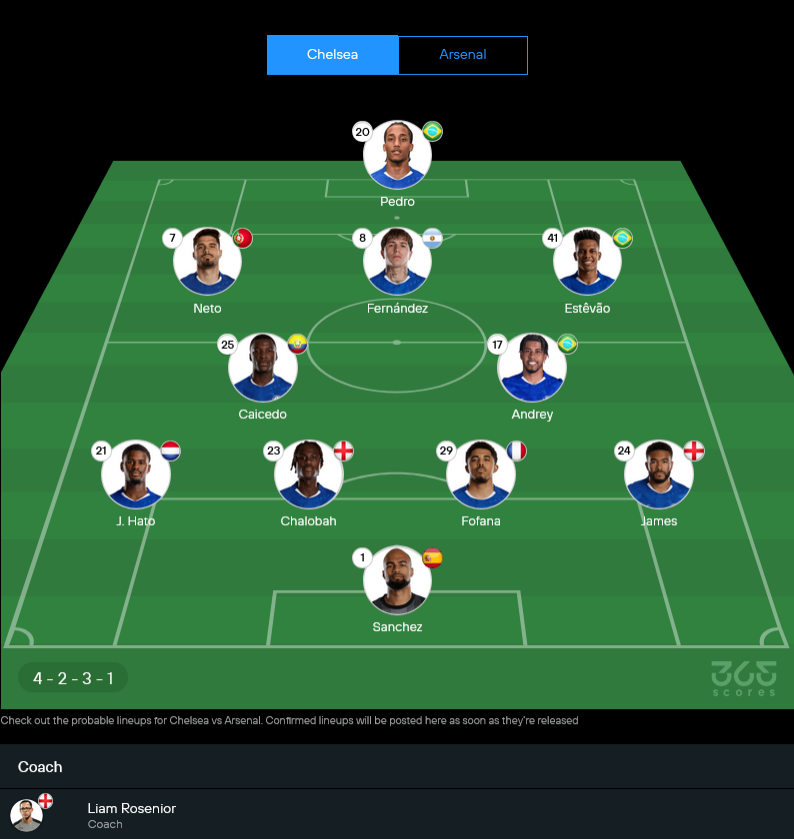 ฝั่งทีมเยือนยังมีลิสต์เดี้ยงยาวเหมือนกัน ทั้งริคคาร์โด คาลาฟิออรี, คริสเตียน มอสเกอรา, แม็กซ์ ดาวแมน ที่พักยาว และปิเอโร อินกาปิเอ ที่ยังต้องเช็กความฟิต แต่แกนหลักชุดใหญ่ยังพร้อมลุยครบ ระบบ 4-3-3 ที่อาร์เตต้าถนัดยังถูกส่งลงมาเต็มข้อ นำโดยสามประสาน ซาก้า ยอเคเรส ทรอสซาร์ ขณะที่กลางสนามใช้ไรซ์จับคู่ซูบิเมนดีกับโอเดการ์ดคุมจังหวะ เกมนี้อาร์เซนอลดูพร้อมกว่าในหลายมิติ และการเซ็ตเกมจากแดนหลังของราย่ากับซาลิบา ยิ่งช่วยให้ทีมขึ้นเกมได้ลื่น