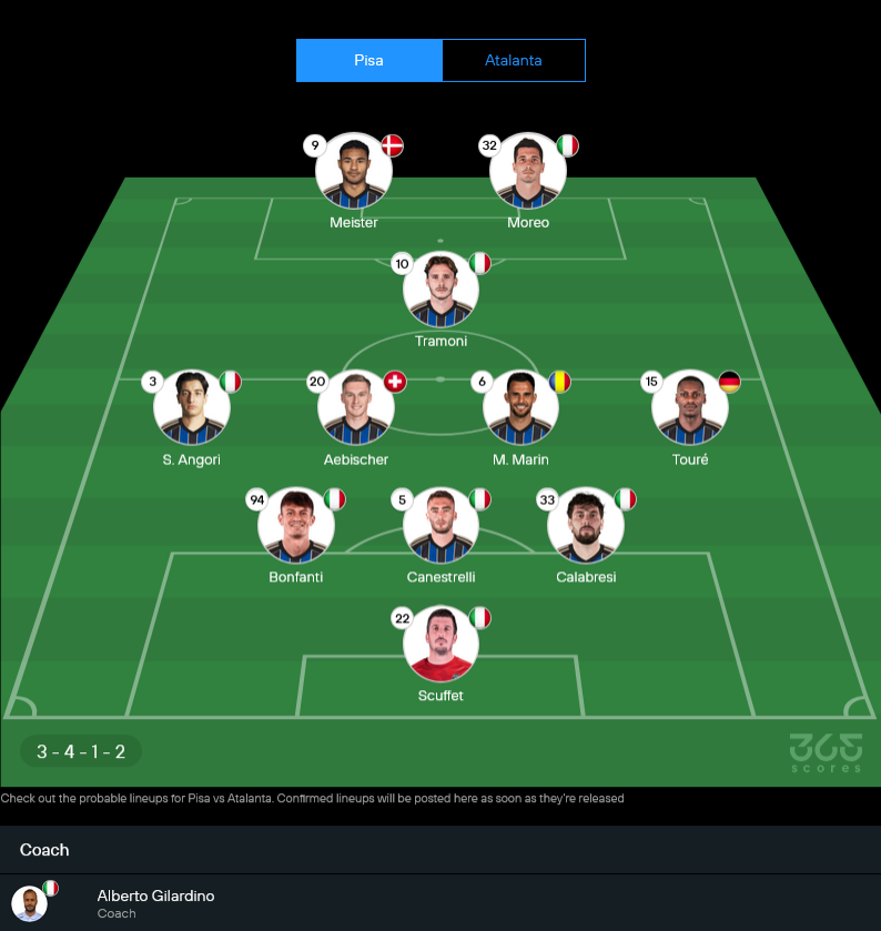| 25/08/2025 | เซเรีย อา | อตาลันต้า 1–1 ปิซ่า |