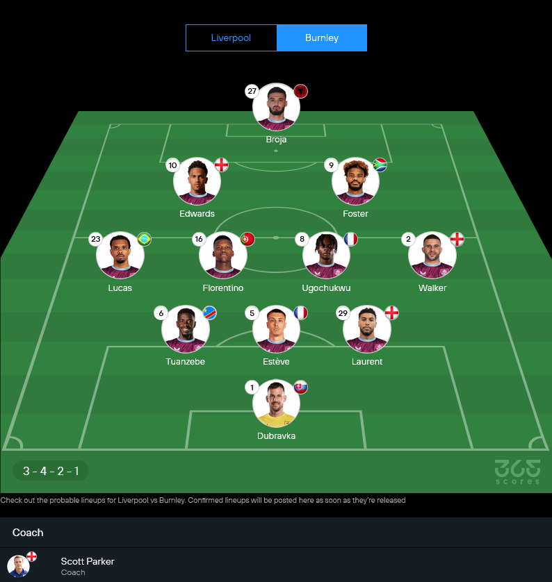 ฝั่งเบิร์นลีย์ของ สกอตต์ ปาร์คเกอร์ มีปัญหาตัวเจ็บเยอะไม่แพ้กัน จากลิสต์ที่โชว์บนหน้าจอ มีทั้ง คอนเนอร์ โรเบิร์ตส์, เซกี แอมดูนี่, จอร์แดน เบเยอร์, ไมค์ เทรซอร์ และ เซียน เฟลมมิ่ง ที่ต้องพักยาว ขณะที่ จอช คัลเลน กับ โจ วอร์รัลล์ ถูกเช็กอาการในสถานะก้ำกึ่ง มีลุ้นแต่ไม่การันตีลงเล่น