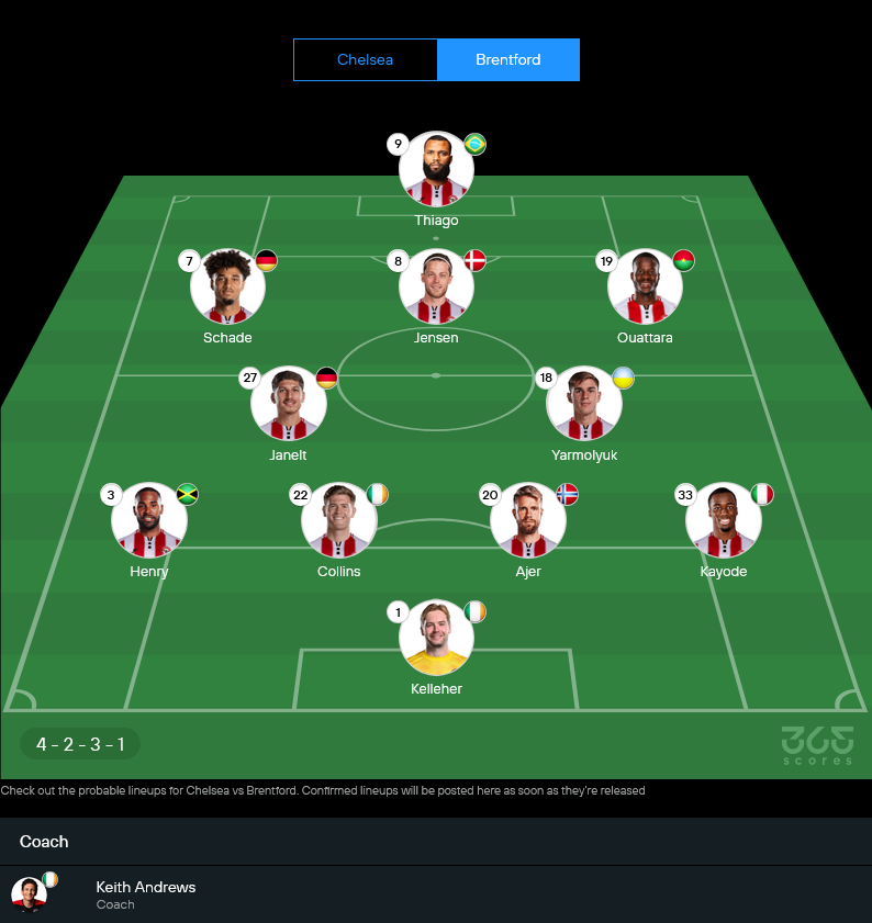 ฝั่งเบรนท์ฟอร์ดของ คีธ แอนดรูว์ส ต้องขาดตัวสำคัญหลายคนเหมือนกัน ทั้ง อันโตนี มิลัมโบ, ฟาบิโอ คาร์วัลโญ่, โจชัว ดาซิลวา และ จอร์แดน เฮนเดอร์สัน ที่ยังเจ็บยาว แต่ข้อดีคือโครงหลักชุดที่ฟอร์มดีช่วงหลังยังอยู่กันครบ โดยเฉพาะแนวรุกที่เคลื่อนที่กันจัดจ้าน