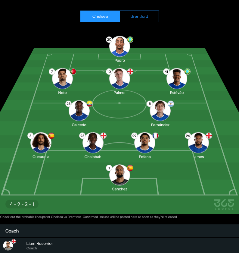 อย่างไรก็ตาม โครงสร้าง 4-2-3-1 ยังเป็นระบบหลักที่ทีมถนัด แนวรุกจัดหนักวาง เปโดร เป็นหน้าเป้า คอยให้ โคล พัลเมอร์ เดินเกมอยู่ด้านหลัง ขนาบข้างด้วย เนโต้ และ เอสเตวาโอ ที่สลับขึ้นสุดเส้นตัดเข้าในได้ตลอด กลางรับใช้คู่หู ไกเซโด้ กับ เอ็นโซ่ เฟร์นานเดซ ที่คอยตัดเกมและเริ่มจังหวะบุกจากแดนลึก แบ็กสองฝั่งเป็น รีซ เจมส์ กับ มาร์ก คูคูเรญ่า สนับสนุนเกมรุกอย่างต่อเนื่อง