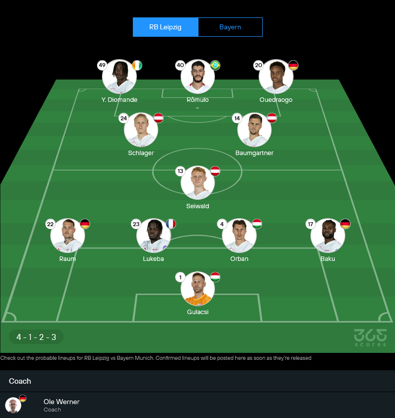 โอเล่ แวร์เนอร์ เริ่มหายใจโล่งหลังทีมเพิ่งปลดล็อกเก็บชัยในลีกได้อีกครั้ง บรรยากาศในทีมกลับมาคึกคัก เกมนี้พร้อมจัดชุดใหญ่ลงสู้เต็มสูบ ระบบจะมาในแบบ 4-1-2-3 เน้นเพรสสูงและสวนกลับเร็วตามสไตล์หนุ่มไฟแรงของไลป์ซิก