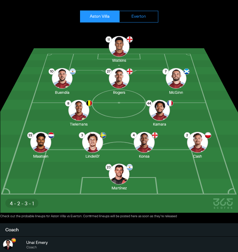 เอเมรี่ยังยึดแท็คติก 4-2-3-1 ที่ทีมถนัด แดนหน้าวางโอลลี่ วัตกิ้นส์ เป็นหน้าเป้า โดยมีสามตัวรุกอย่าง เอมิเลียโน่ บูเอ็นเดีย, มอร์แกน โรเจอร์ส และจอห์น แม็กกินน์ ป่วนแนวรับคู่แข่ง ขณะที่คู่กลางใช้ ยูรี่ ตีเลอม็องส์ ยืนคู่ บูบาก้าร์ กามาร่า ถ้าฟิตไม่ทันอาจสไลด์ใช้ตัวสำรองลงแทน แนวรับมี ยานน์ มัทเซ่น, วิคตอร์ ลินเดอเลิฟ, เอซรี่ คอนซ่า และ แม็ตตี้ แคช คอยล็อกหลังบ้าน