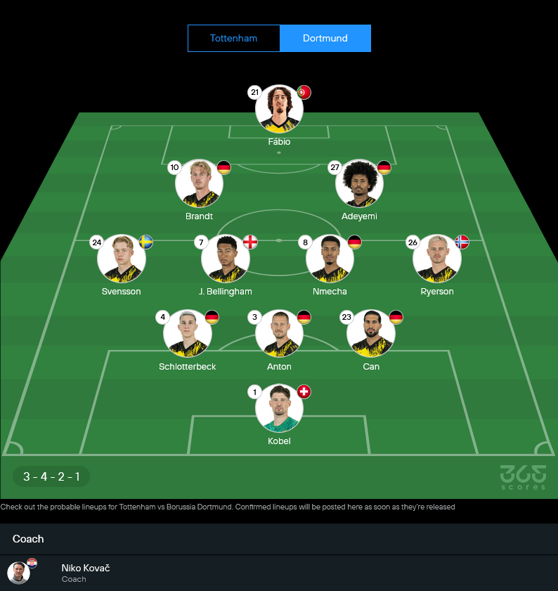 จัวง โชเอา ปาลินญ่า มีอาการเจ็บเล็กน้อยแต่คาดว่าน่าจะผ่านเช็คฟิตทัน เกมนี้สเปอร์สน่าจะยึดระบบ 4-2-3-1 ตามที่ใช้มาล่าสุด เน้นคุมกลางด้วยคู่มิดฟิลด์ตัวรับ แล้วปล่อยแนวรุกสปีดจัดคอยโจมตีแนวรับดอร์ทมุนด์