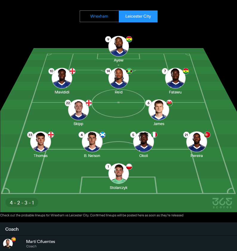 เลสเตอร์ของ มาร์ตี ซิฟูเอนเตส จะยังไม่มี อารอน แรมซีย์ (ยืมจากเบิร์นลีย์) ที่เจ็บแฮมสตริงช่วงปลายปี รวมถึง แฮร์รี ซูตตาร์ ที่เดี้ยงเอ็นร้อยหวาย ทำให้ตัวเลือกในแผงหลังและกลางรุกหายไปบางส่วน แต่โครงหลักยังจัดเต็มด้วยระบบ 4-2-3-1 เน้นคุมจังหวะกลางสนามแล้วค่อยเร่งสปีดจากสามแนวรุกตัวจี๊ด