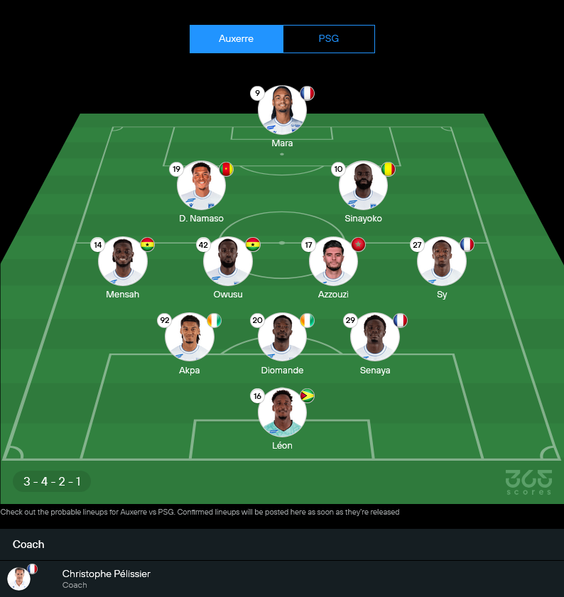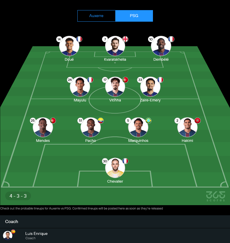 หลุยส์ เอ็นริเก้ ยังคงไม่มี ลี คังอิน, มัตเวย์ ซาโฟนอฟ, เควนติน เอ็นด์จานตู และ ฟาเบียน รุยซ์ ที่เจ็บยาว ส่วน ชูเอา เนเวส ยังต้องเช็กฟิต จึงต้องหมุนทีมบางตำแหน่ง แต่ตัวหลักอย่าง มาร์กินโญส, อัชราฟ ฮาคิมี, นูโน่ เมนเดส ยังพร้อมลุย เกมนี้คาดว่าจะเดินหน้าใส่ในระบบ 4-3-3 ตามถนัด เน้นครองบอลบุกต่อเนื่องแล้วใช้ความเร็วริมเส้นเจาะแนวรับเจ้าถิ่น