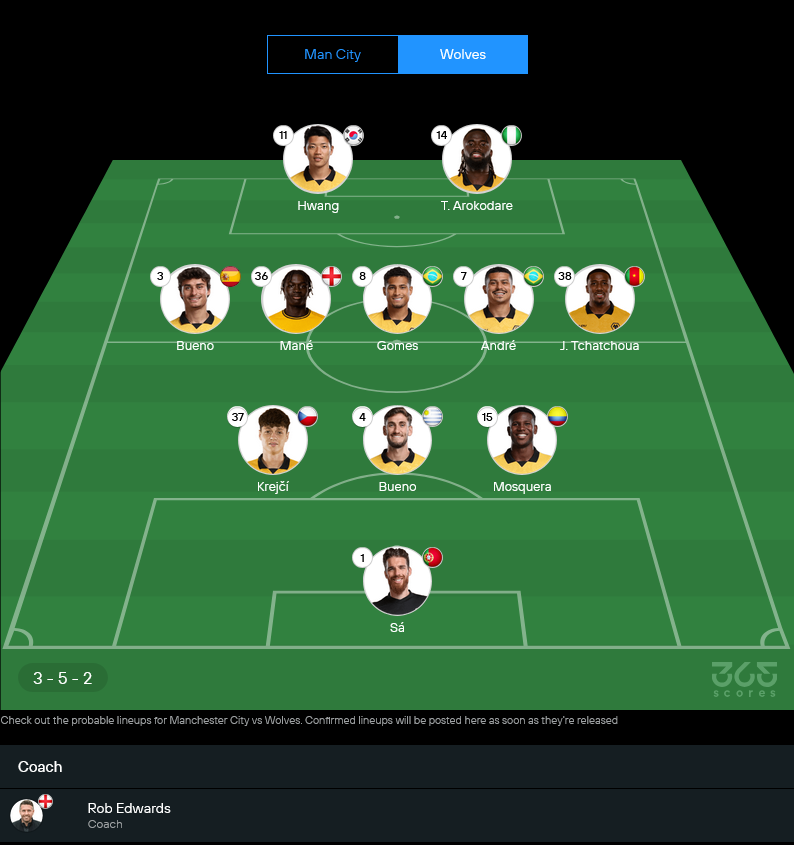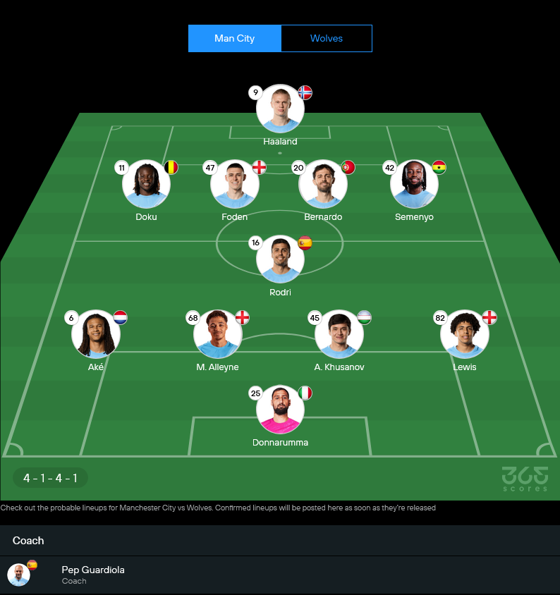 ระบบที่น่าจะใช้คือ 4-1-4-1 วาง โรดรี ยืนกลางรับหน้าแผงหลัง เปิดทางให้แนวรุกสี่ตัวบนวิ่งสลับตำแหน่งปั่นเกมรุกใส่วูล์ฟส์ตลอด 90 นาที