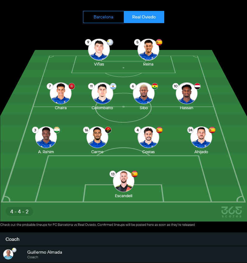 โอเบียโด้ของกุนซือ กิเยร์โม่ อัลมาด้า มีเรื่องให้กังวลตรงนักเตะสำคัญอย่าง เอริค ไบยี่ และ โอวี่ เอยาเรีย ยังติดสถานะเช็กฟิต ถ้าไม่พร้อมจะทำให้ตัวเลือกเกมรับและแดนกลางบางลงไปอีก อย่างไรก็ดี ชุดหลักจากภาพไลน์อัพยังครบ ระบบ 4-4-2 เน้นเก็บหลังให้แน่น แล้วฝากความหวังไว้ที่คู่หน้า เฟเดริโก้ วินญาส กับ อัลเบร์โต้ เรน่า ในการฉกฉวยโอกาสสวนกลับ