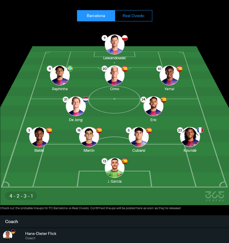 โครงสร้างทีมจากภาพล่าสุดคาดว่า บาร์ซ่าจะยืนระบบ 4-2-3-1 เน้นครองบอลบุกใส่ตามสไตล์ ถอย เอริค การ์เซีย ยืนคู่ เฟรงกี้ เดอ ย็อง ในโซนมิดฟิลด์ตัวรับ คอยคุมจังหวะเกมและช่วยตัดบอลหน้าแผงหลัง