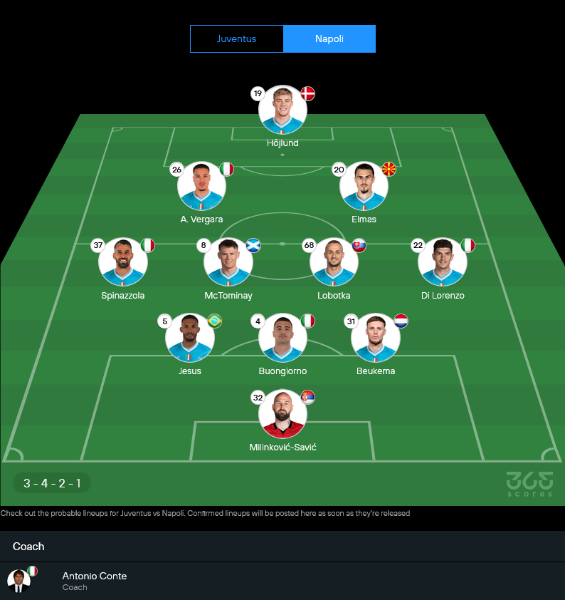 ฝั่งนาโปลีของคอนเต้ เจ็บเยอะไม่แพ้กัน แถมบางรายเป็นตัวหลักที่มีผลกับระบบชัดเจน ทั้ง เควิน เดอ บรอยน์, ฟร้องค์ อองกิสซ่า และ บิลลี่ กิลมัวร์ ทำให้แดนกลางต้องปรับใหม่หมด ยังไม่นับดาวยิงอย่าง ดาวิด เนเรส กับกองหลังอย่าง อามีร์ ราห์มานี่ ที่ยังหายไม่ทัน รวมถึง มัตเตโอ โปลิตาโน ก็เดี้ยง ส่วน อเล็กซ์ เมเร็ต กับ อองกิสซ่า ถูกมองว่ายังมีอาการกังวลเรื่องความฟิต