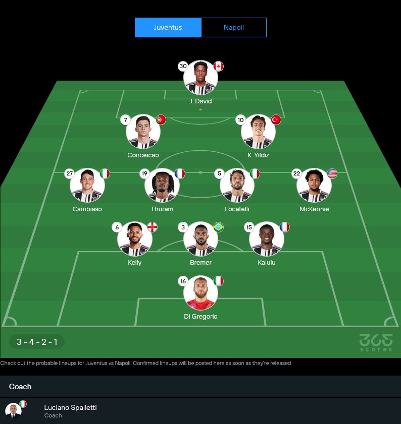 จากภาพไลน์อัพคาดว่า ยูเว่จะจัดระบบ 3-4-2-1 เน้นเกมรุกทางริมเส้นและการทะลุช่องระหว่างไลน์
