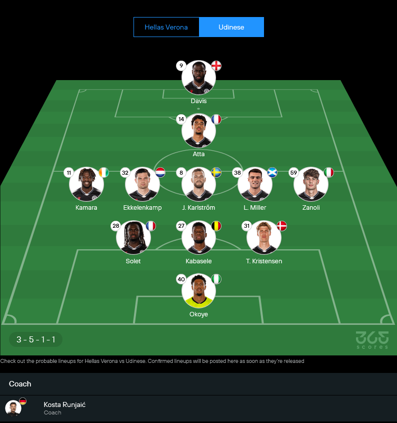 ตัวเจ็บเวโรน่าตามภาพประกอบจากแผงอินจูรี่ก็เพียบ ทั้ง อาร์เมล เบลล่า-ค็อตชัป, โทมัส ซุสลอฟ, ฌอง-ดาเนียล อัคปา อัคโปร, โมอาเตซเซ็ม อัล-มุสราติ, นิโกลัส วาเลนตินี่ และ ราฟิค เบลกาลี ยังหมดสิทธิ์ บวกกับ มาร์ติน เฟรเซ ที่สภาพยัง “เช็คฟิต” ถือว่ากุนซือเจ้าถิ่นต้องปะผุทีมพอสมควร