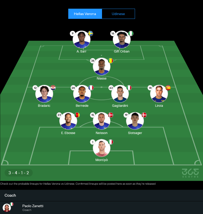 เวโรน่าของ เปาโล ซาเน็ตติ ปัญหาใหญ่คือสภาพทีมที่เดี้ยงกันยาวเป็นแถบ ทั้ง อาร์เมล เบลล่า-ค็อตชัป, มาร์ติน เฟรเซ, โตมาส ซุสลอฟ, ฌอง-ดาเนียล อัคปา อัคโปร, โมอาเตซเซ็ม อัล-มุสราติ, นิโกลัส วาเลนตินี่ และ ราฟิค เบลกาลี ต้องพักต่อเนื่อง ทำให้ตัวเลือกแนวรับและกลางสนามบางลงชัดเจน