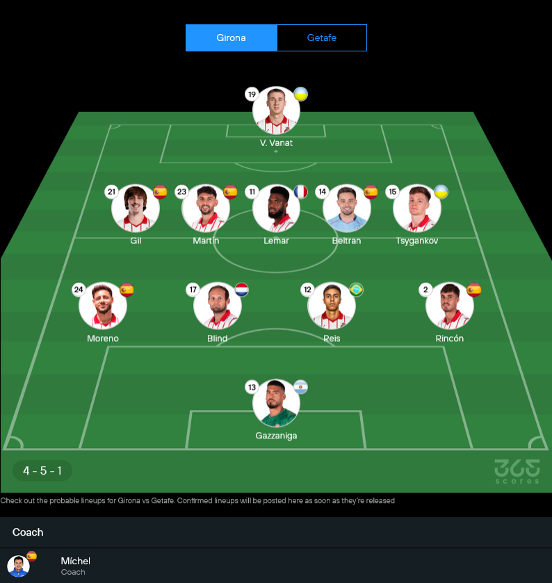 จีโรน่าของกุนซือ มิเชล จะยืนระบบ 4-5-1 เน้นแพ็คกลางแน่นแล้วปล่อยตัวรุกสอดจากด้านข้างช่วยวานาตปิดบัญชี