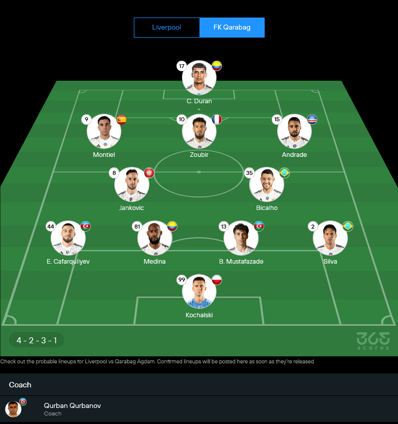 การาบักของเกอร์บาน เกอร์บานอฟภาพรวมถือว่าพร้อมกว่า เจ้าบ้านเยอะ ปัญหาหลักคือผู้รักษาประตูตัวเก๋า ชาฮรูดิน มาฮามมาดาลิเยฟ ที่เจ็บยาว ทำให้โคชัลสกีต้องทำหน้าที่เฝ้าเสาต่อไป ส่วนแนวรุกมีข่าวไม่สมบูรณ์ของคาดี บอร์เจส ให้ลุ้น แต่แกนหลักชุดที่บุกยิงแฟร้งค์เฟิร์ตยังอยู่กันครบ