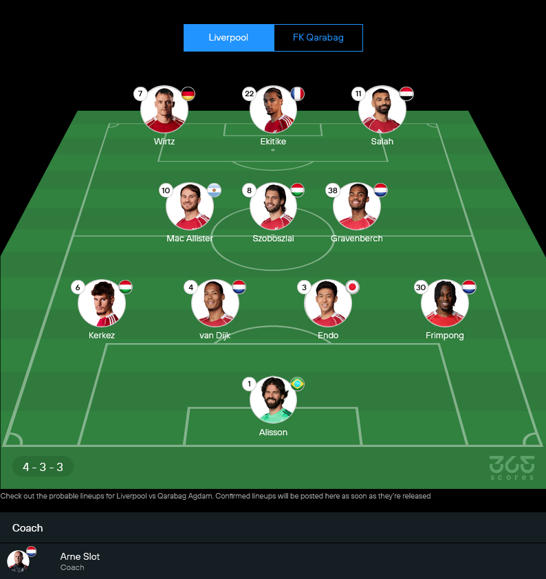 ลิเวอร์พูลของสลอตยังมีปัญหาตัวเจ็บยาวเพียบ แผงหลังหายไปหลายราย ไล่ตั้งแต่โจวานนี่ เลโอนี, คอเนอร์ แบร็ดลีย์, อิบราฮิมา โกนาเต้ รวมถึงอเล็กซานเดอร์ อิซัค และสเตฟาน บาจเซติช ที่เดี้ยงกันยาวทั้งแพ็ก ยังไม่พอ เฟเดริโก้ คิเอซา ก็ยังไม่พร้อม ขณะที่โจ โกเมซ มีอาการไม่สมบูรณ์ต้องลุ้นเช็คฟิตอีกที