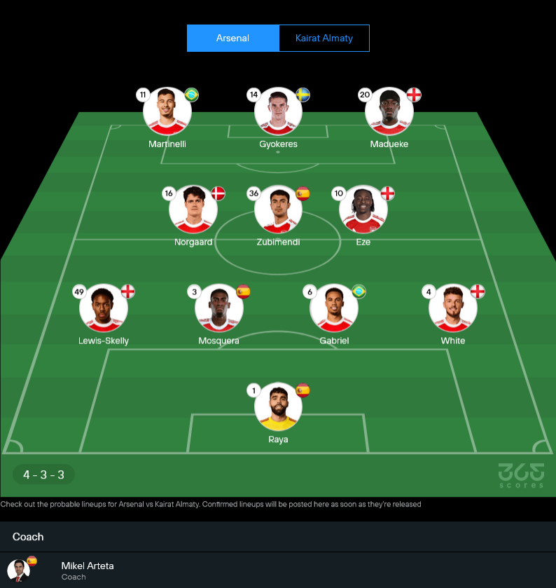 ข่าวร้ายก่อนเกมคือ อาร์เซนอลยังไม่มี ดีแคลน ไรซ์ กับ มิเกล เมรีโน่ ที่โดนโทษแบนสะสมใบเหลือง ส่วน ไค ฮาแวร์ตซ์ และดาวรุ่งอย่าง แม็กซ์ ดาวแมน เจ็บพักยาว ขณะที่ ริคคาร์โด้ คาลาฟิโอรี่ ต้องเช็กฟิตอีกรอบ แต่โดยรวมขุมกำลังหลักยังอยู่ครบ อาร์เตต้าจัดชุดใหญ่เน้นปิดจ็อบในบ้านแบบไม่ให้เรื่องยืดเยื้อ ระบบที่ใช้คาดว่าเป็น 4-3-3 เล่นเกมรุกเต็มตัวตามสไตล์บอลครองพื้นที่ของเขา
