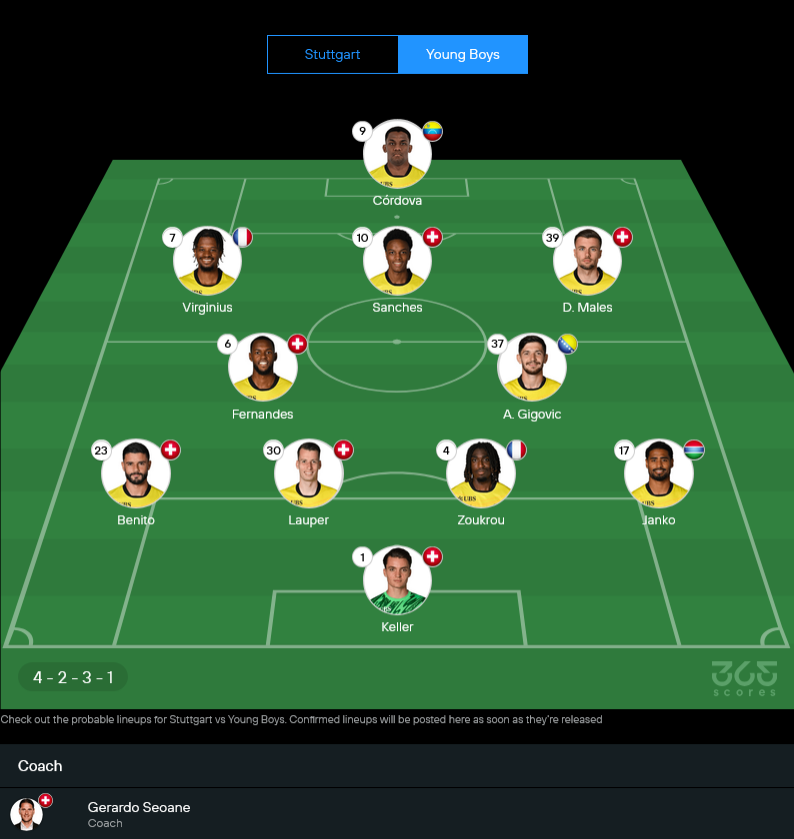 เกราร์โด้ เซอโออาเน่ ต้องปวดหัวพอสมควร เพราะตัวหลักหายไปเพียบ ตั้งแต่ เอบริมา คอลเลย์, ไรอัน แอนดรูว์ส, ฟาซิเน็ต คองเต้, เชาเอน ฮัดจาม ที่เดี้ยงทั้งหมด แถม รายัน ราเวโลชง โดนแบนอีกหนึ่ง ทำให้ตัวเลือกในแดนกลางกับแนวรับบางลงชัดเจน แต่ยังยึดระบบ 4-2-3-1 สู้ตามสไตล์ทีมสวิส เน้นเกมรุกวูบวาบจากแนวรุกสี่ตัวบน
