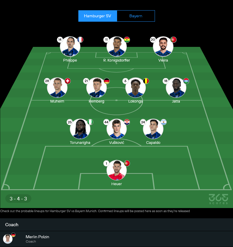 คาดว่าจะมาในระบบ 4-2-3-1 เล่นเกมรุกเต็มรูปแบบ กลางรับใช้คู่หู โยชัว คิมมิช กับ เลออน โกเร็ตซ์ก้า คอยคุมจังหวะ เปิดทางสามตัวรุกด้านหลัง แฮร์รี่ เคน คือ เลนนาร์ต คาร์ล ตัวฟรีโรลคอยเชื่อมเกมร่วมกับ ไมเคิล โอลิเซ่ ทางขวา และ หลุยส์ ดิอาซ ทางซ้าย แบ็กสองข้าง ฮิโรกิ อิโตะ กับ ทอม บิสชอฟ พร้อมเติมสูงตลอด เกมนี้จะเป็นงานบุกใส่แทบจะฝ่ายเดียวตามสไตล์ทีมต่อ