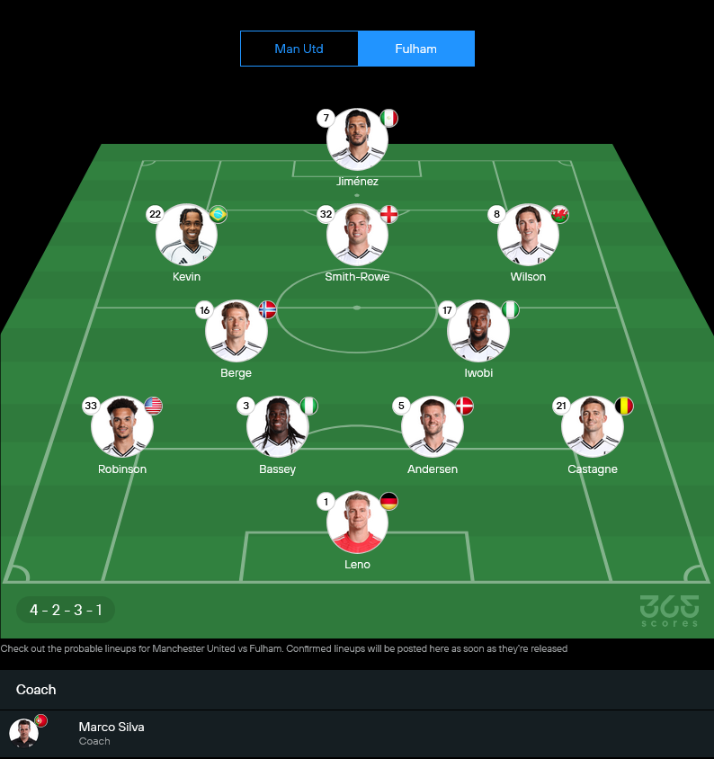 ฝั่งทีมเยือนของมาร์โก ซิลวา มีตัวปัญหาพอสมควร โรดริโก้ มูนิซ, ซาซ่า ลูคิช และ ออสการ์ บ็อบบ์ เดี้ยงหมดสิทธิ์ลง ส่วน เคนนี่ เตเต้ ยังต้องลุ้นความฟิต แต่แกนหลักอย่าง เลโน่, แอนเดอร์เซ่น, อิโวบี้ และ ฆิเมเนซ ยังอยู่ครบ ระบบก็ยังยึด 4-2-3-1 เช่นกัน เล่นกันค่อนข้างไหลลื่นในจังหวะสวนกลับ