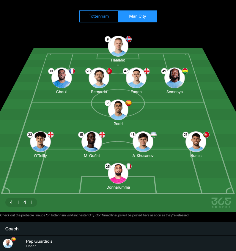 ฝั่งแมนฯซิตี้ของเป๊ป กวาร์ดิโอลา มีปัญหาใหญ่ที่เกมรับเหมือนกัน เมื่อเสียทั้งรูเบน ดิอาส, จอห์น สโตนส์ และยอสโก กวาร์ดิโอล ไปพร้อมกัน รวมถึงมาเตโอ โควาซิช, ซาวินโญ, เฌเรมี โดคู ที่เดี้ยงเพิ่ม ทำให้ต้องปรับใช้คู่เซ็นเตอร์หน้าใหม่ และเน้นการครองบอลลดความเสี่ยงแทน อย่างไรก็ดี ตัวรุกยังเต็มสูบทั้งฟิล โฟเดน, แบร์นาร์โด ซิลวา, รายาน แชร์กี และอ็องตวน เซเมนโย พร้อมปั้นโอกาสให้ฮาลันด์ล่าตาข่ายแบบจัดหนัก