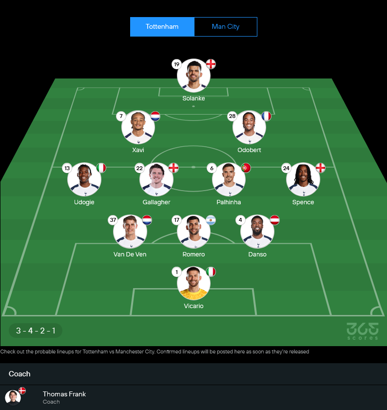 สเปอร์สของโธมัส แฟร้งค์ เจอปัญหาตัวเจ็บยาวเป็นหางว่าว ทั้งเจมส์ แม็ดดิสัน, โมฮัมเหม็ด คูดุส, โรดริโก้ เบนตานกูร์, ริชาร์ลิซอน, เดยัน คูลูเซฟสกี้, เบ็น เดวี่ส์, ลูคัส เบิร์กวัลล์ และเปโดร ปอร์โร่ ขณะที่มิคกี้ ฟาน เดอ เฟน ถูกประเมินว่าสภาพไม่เต็มร้อย เกมนี้เลยต้องปรับใช้แผนหลังสามเน้นความเหนียว แล้วฝากความหวังเรื่องสกอร์ไว้ที่หน้าเป้าและสองตัวรุกด้านหลัง การจัดทีมของกุนซือเดนิชดูมีบาลานซ์มากขึ้น เน้นบีบตรงกลางและสวนเร็วตามสไตล์บอลอังกฤษยุคใหม่ ถือเป็นจุดที่น่าโฟกัสสำหรับสาย วิเคราะห์บอล