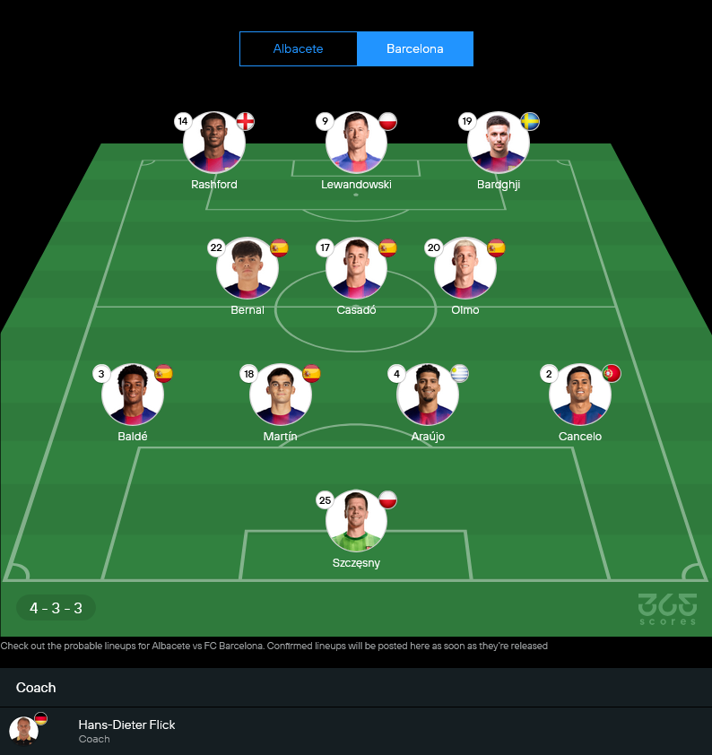 แต่ต้องยอมรับว่าเรื่องคุณภาพและความลึกของขุมกำลัง บาร์เซโลน่ายังเหนือกว่าหลายช่วงตัว ฟลิคกำลังพาทีมเดินหน้ากวาดชัยทั้งในลีกและยุโรป เกมรุกมีตัวเลือกเพียบ ไม่ว่าจะเป็นแรชฟอร์ด, เลวานดอฟสกี้ หรือโอลโม่ ทุกคนมีทีเด็ดเปลี่ยนเกมได้ตลอด นาทีที่บาร์ซ่าเร่งเครื่อง ความกดดันจะถาโถมใส่อัลบาเซเต้แบบหายใจไม่ทัน